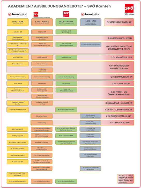Politische Mitwirkung und Gestaltung verlangt von jeder und jedem Einzelnen nicht nur grenzenloses Engagement, sondern auch die entsprechenden Fähigkeiten und Kompetenzen. Politische Bildung ist daher für die politische Ehren- und Amtsträger:innen essentiell. Das Renner-Institut Kärnten bietet daher, gemeinsam mit dem Gemeindevertreterverband Kärnten (GVV) und dem Sozialdemokratischen Wirtschaftsverband Kärnten (SWV) verschiedene Lehrgänge an, welche miteinander kombiniert besucht werden können.